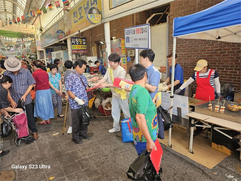 의령군 직원들이 지난 추석 연휴 기간 재래시장을 찾아 도로명주소 생활화를 위한 홍보 활동을 하고 있다.