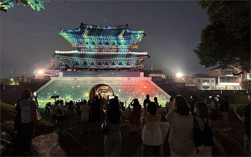 ‘2024 진주문화유산 야행’ 행사 중에 화려하게 불을 밝힌 진주성 공북문 미디어아트. 이상 진주시