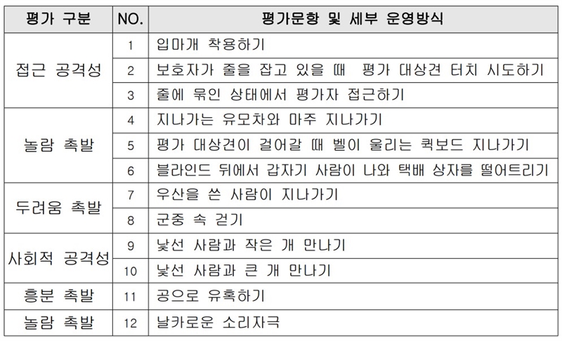기질 평가는 1마리당 25만 원의 평가 비용을 소유자가 납부해야 하며 ▲대상 반려견에게 접근할 시 놀람·두려움을 유발하는 상황 ▲다른 개나 사람이 지나갈 때 등 12개의 상황에서 맹견의 공격성과 소유자의 상호작용 등을 평가해 공격성이 낮다고 평가되는 경우 시장의 맹견사육허가를 받게 된다.