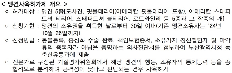 이번 시행에 따라, 기존 맹견 소유자는 오는 26일까지 맹견사육허가를 받아야 하며, 신규로 맹견을 사육하는 경우 소유권을 취득한 날로부터 30일 이내 맹견사육허가 신청을 해야 한다.