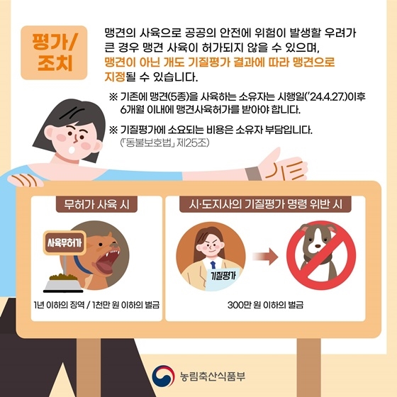 맹견사육허가 신청 후 전문가로 구성된 기질평가위원회의 기질 평가를 거쳐 공격성이 낮다고 평가받은 경우 맹견사육이 허가된다.