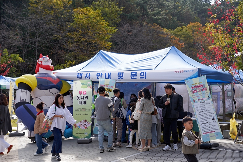 행사장 입구에 있는 행사 안내 부스. 진양호공원 SNS 팔로우 등 미션을 하면 무료로 체험쿠폰을 받을 수 있다.
