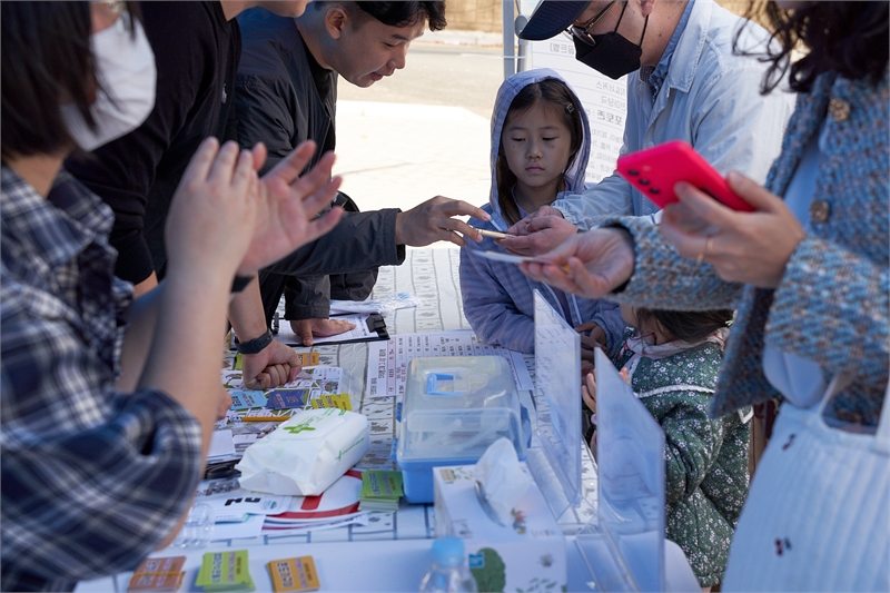 어린이가 원하는 체험 쿠폰을 받고 있다.