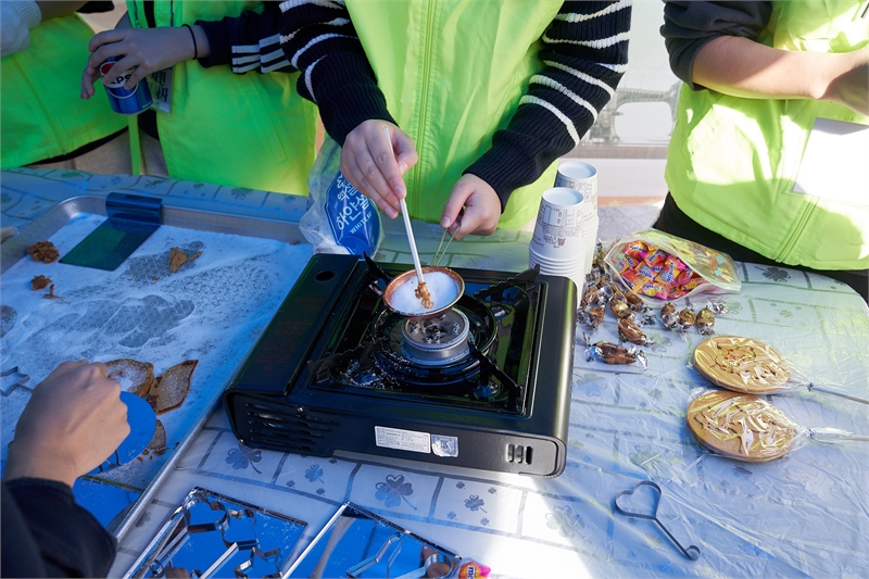 봉사활동 학생들이 설탕을 녹여 '달고나'를 만들고 있다.
