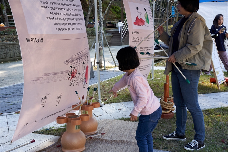 어린이가 어머니와 함께 투호 화살을 투호통으로 던져넣고 있다.