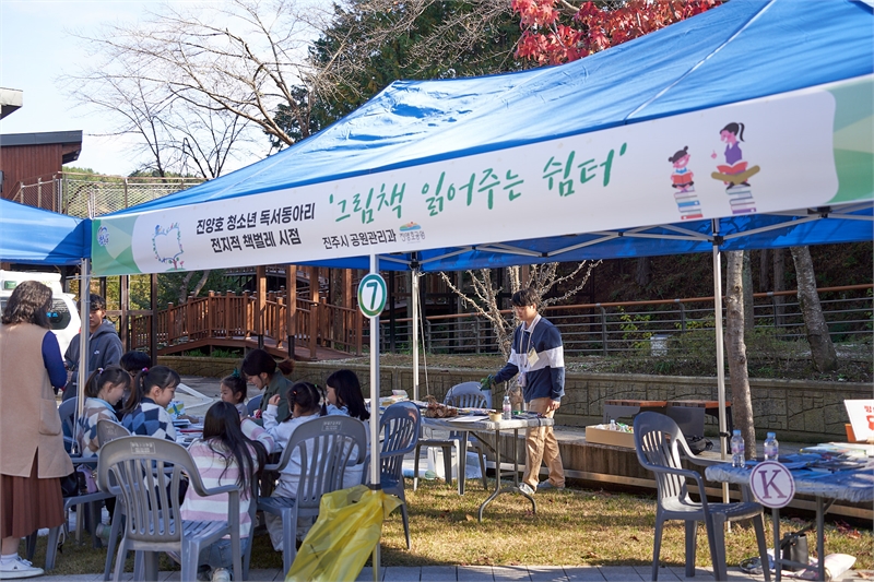 청소년 독서동아리 학생들이 '그림책 읽어주는 쉼터'에서 아이들에게 그림책을 읽어주며 설명을 하고 있다.