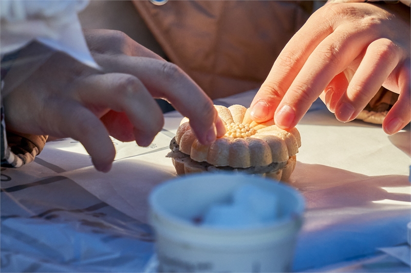 한 어린이가 국화과자에 들어갈 앙꼬를 만들며 진행요원의 설명을 듣고 있다.
