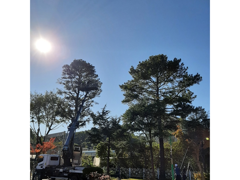 위탁업체 근로자들이 학교 수목 가지치기를 하고 있다.