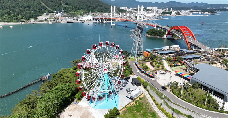 초양도에서 운영 중인 대관람차(가운데) 모습. 바로 오른쪽 위가 '아라마루 아쿠아리움'이고 삼천포대교다. 회전목마는 대관람차와 아쿠아리움 가운데 있다. 이상 '아라마루 아쿠아리움'