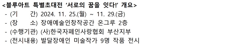 ‘서로의 꿈을 잇다!’라는 주제로 열리는 이번 전시회는 ‘블루아트’ 작가들의 예술적 열정과 상상력이 하나로 연결돼 ‘발달장애인 인식개선’이라는 중요한 목표를 실현하는 연대의 장이다. 이를 통해 부산 시민들에게 예술을 통한 공감과 소통의 기회를 제공하고자 한다.