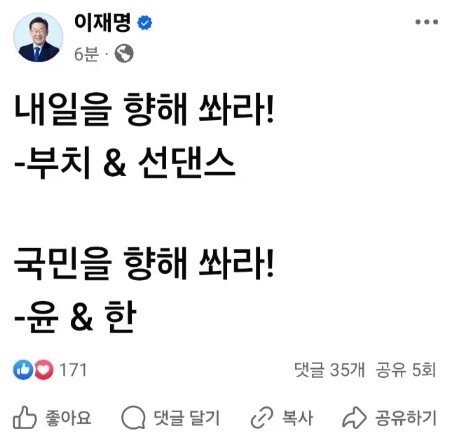 이 대표는 이날 사고 발생 1시간여 지난 오전 10시 7분쯤 자신 페이스북에 "내일을 향해 쏴라!-부치 & 선댄스. 국민을 향해 쏴라!-윤 & 한"이란 글을 올렸다.
