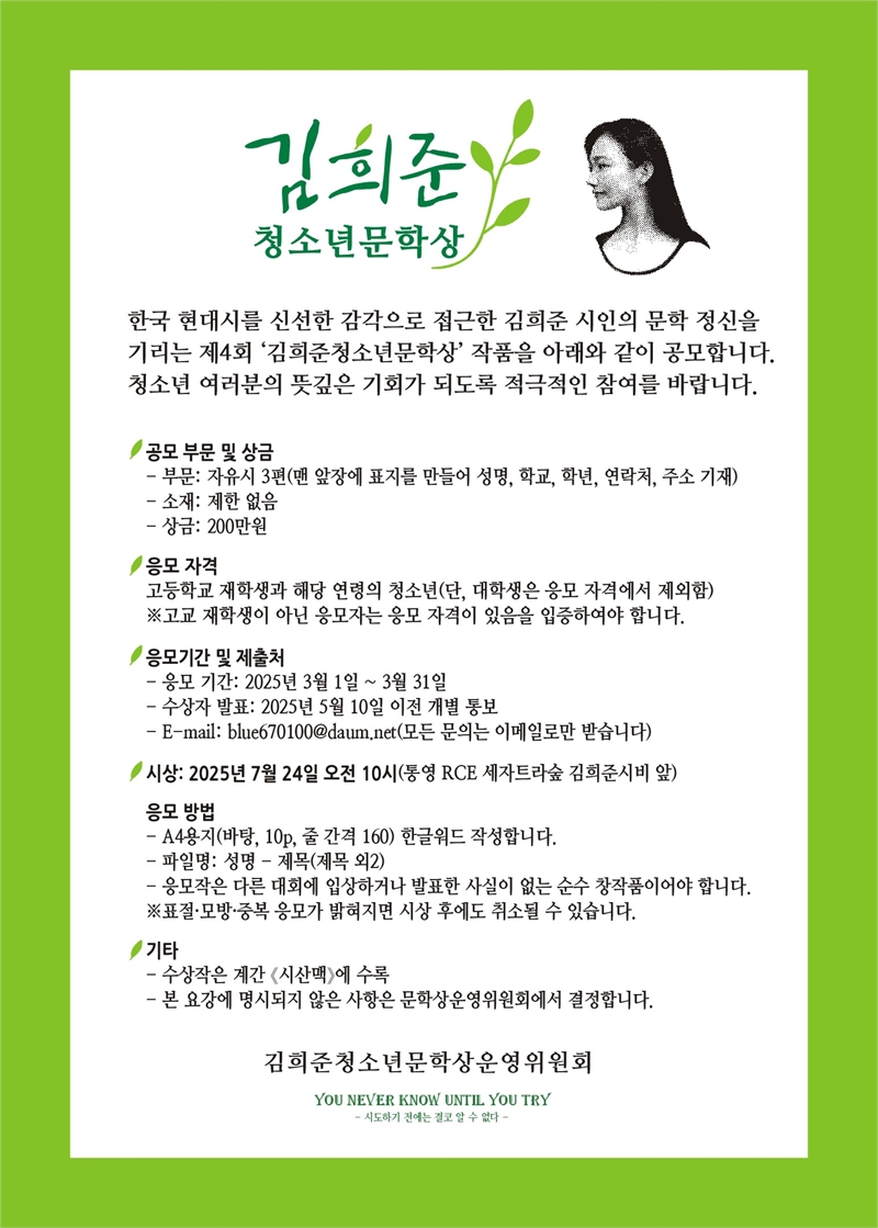 김희준청소년문학상운영위원회는 7일 한국 현대시를 신선한 감각으로 접근한 김희준 시인의 문학 정신을 기리는 제4회 ‘김희준청소년문학상’ 작품을 공모한다고 밝혔다.