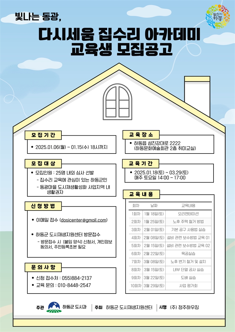 경남 하동군은 오는 15일까지 ‘빛나는 동광, 다시세움 집수리 아카데미’ 교육 참여자를 모집한다.