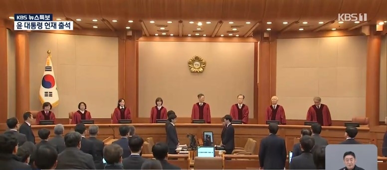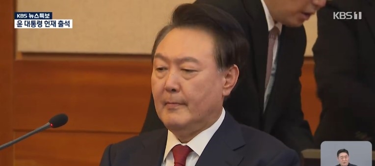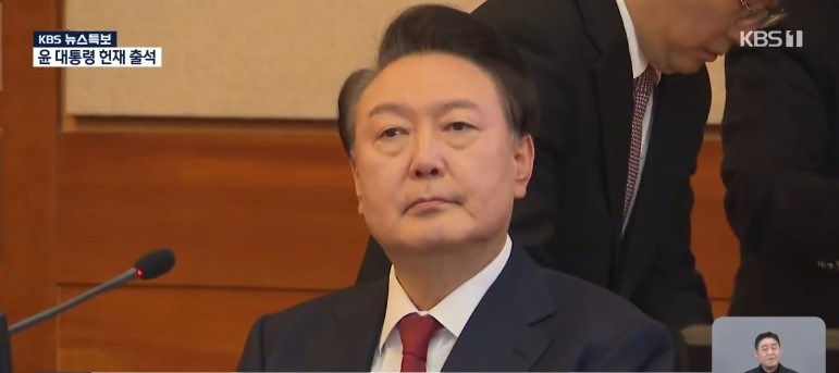 윤석열 대통령과 변호인들이 21일 서울 종로구 헌법재판소에서 열린 탄핵심판 3차 변론 기일에 출석해 있다. KBS