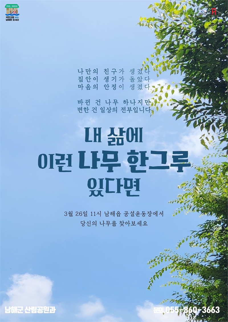 남해군 관계자는 “내 나무갖기 캠페인은 나무를 사랑하고 자연을 보호하고자 진행하는 캠페인으로, 나만의 나무로 일상 속 행복과 치유를 선물하고자 하는 마음을 담아 배부한다”고 밝혔다.