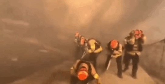 "정말 고생했습니다". 산불로 시커먼 연기가 자욱한 가운데 산등성 바위 위에서 사투를 벌이는 소방대원들의 모습. 순간 강풍이 불자 대원들이 몸을 움크리고 있다. 온라인 커뮤니티