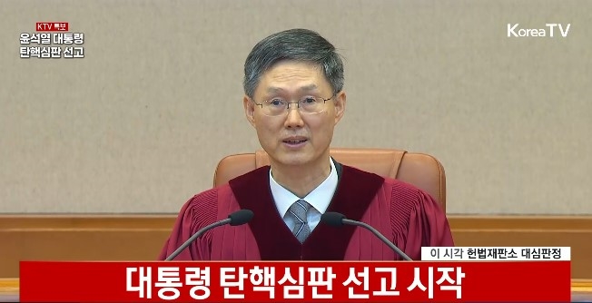 문형배 헌법재판소장 권한대행이 4일 윤석열 대통령 탄핵심판 선고를 시작하고 있다. KTV