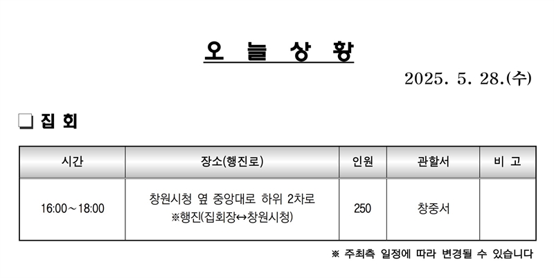 더경남뉴스는 경남경찰청이 제공하는 경남 도내에서 예정된 집회 내용을 주기적으로 전합니다. 각종 집회가 전하는 메시지도 있지만, 교통 정체 등 주민 생활에 직접 관계가 있기 때문입니다. 2 0 더경남뉴스 더경남뉴스 thegnnews@naver.com 더경남뉴스의 기사 더보기 저작권자 ⓒ 더경남뉴스
