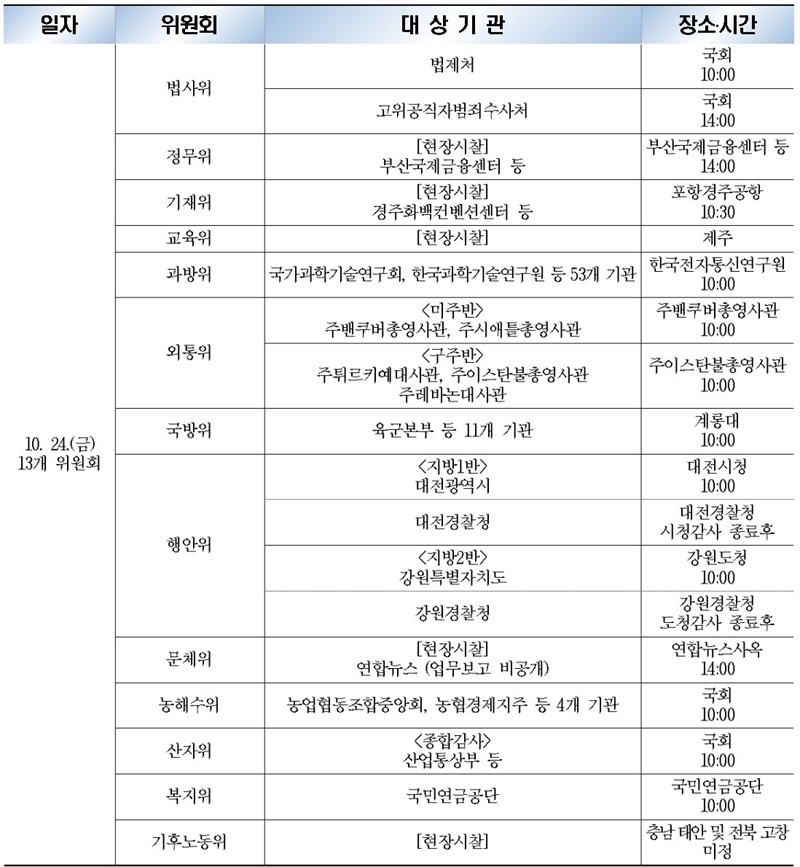 [2025 국정감사] 국회 상임위별 '오늘의 국감'(10월 24일)
