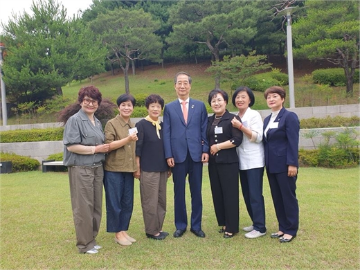 밀알상을 받은 고성읍적십자봉사회 회원들이 한덕수 국무총리와 기념사진을 찍고 있다.