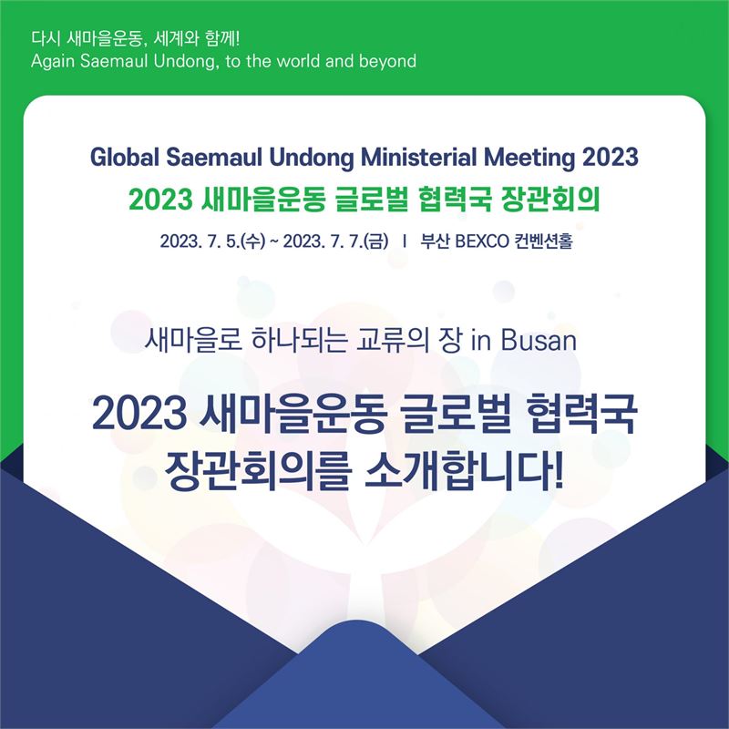 부산시는 ‘새마을운동 글로벌 리그(SGL, Saemaul Undong Global League)’ 회원국 장관급 인사 간 처음으로 개최되는 대규모 국제행사인 '2023 새마을운동 글로벌 협력국 장관회의(Global Saemaul Undong Ministerial Meeting 2023)'를 오는 5일부터 7일까지 3일간 부산 벡스코에서 개최한다고 밝혔다.