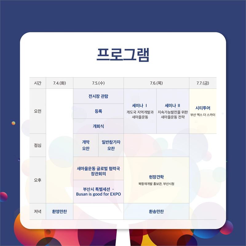 박형준 부산시장은 “이번 ‘장관회의’를 계기로 대한민국의 경제 성장을 이끈 우리 새마을운동을 널리 전 세계로 알리는 것은 물론, 지난 6월에 열린 2030세계박람회 4차 경쟁 발표의 유치 열기를 이어갈 수 있는 중요한 기회가 될 것”이라며 이번 행사의 중요성을 강조했다.