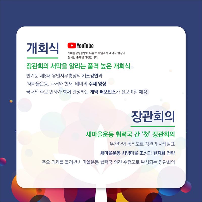 5일 오전 11시 벡스코 컨벤션홀에 열리는 ‘개회식’에서는 한창섭 행정안전부 장관 직무대행의 개회사, 박형준 부산시장과 곽대훈 새마을운동중앙회장의 환영사에 이어, ‘한국은 준비돼 있습니다’라는 주제로 반기문 전 유엔(UN) 사무총장이 기조연설을 한다.