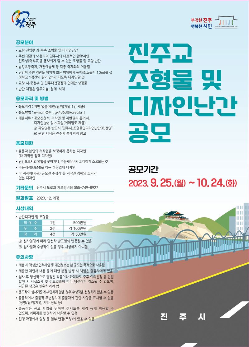 경남 진주시는 지난 1983년에 준공한 진주교에 특색 있고 새로운 볼거리 제공을 위해 조형물 및 난간 디자인 공모전을 진행한다.