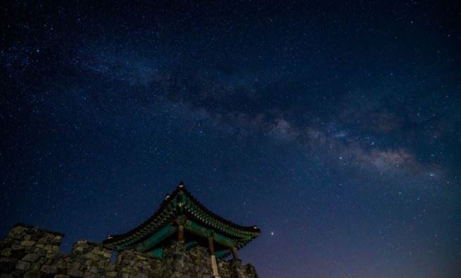 밤하늘 황매산성 망루 위에 비스듬히 누운 은하수 광경. 지난 2018년 5월 24일 찍었다. 합천에서 정창현 기자