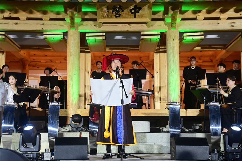 ‘2024 진주문화유산 야행’에서 ‘경상우도 병마절도사’ 역할을 맡은 조규일 진주시장이 중영에서 격문 낭독을 하고 있다.