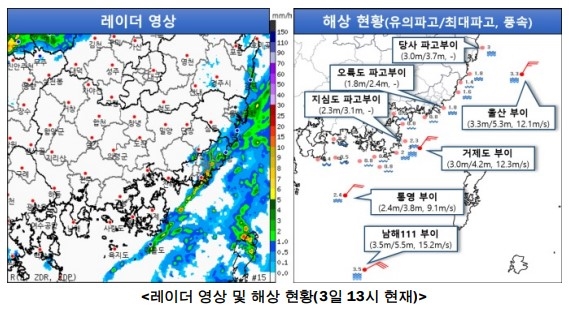 * 해상 파고(유의파고/최대파고/풍속) 현황(3일 13시 기준, 단위(파고:m, 풍속:m/s)