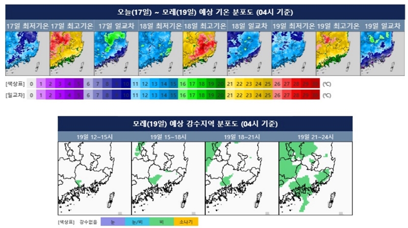 <17~18일 예상 기온 분포도 및 19일 예상 강수지역 분포도>