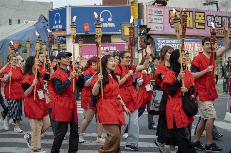 그 옛날 의병들이 들었던 횃불을 치켜든 외국인 참가자들. 대체로 의령군에 사는 외국인들이다.