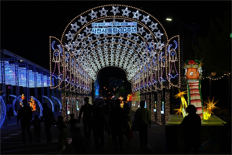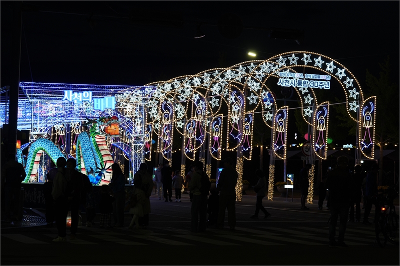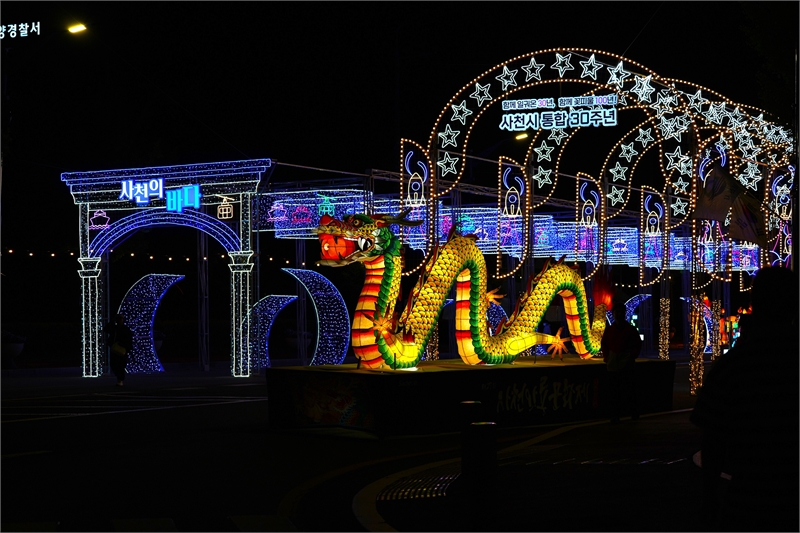 사천와룡문화제가 열린 시청 광장에 설치한 빛거리존의 야경. '사천의 바다'의 문(왼쪽)을 만들고, 와룡(臥龍·누워 있는 용)이 꿈틀거리는 모습(오른쪽)을 형상화 했다. 위에는 사천-삼천포 통합을 상징하는 '함께 일궈온 30주년, 함께 꽃 피울 100년' 문구가 노출되고 있다.