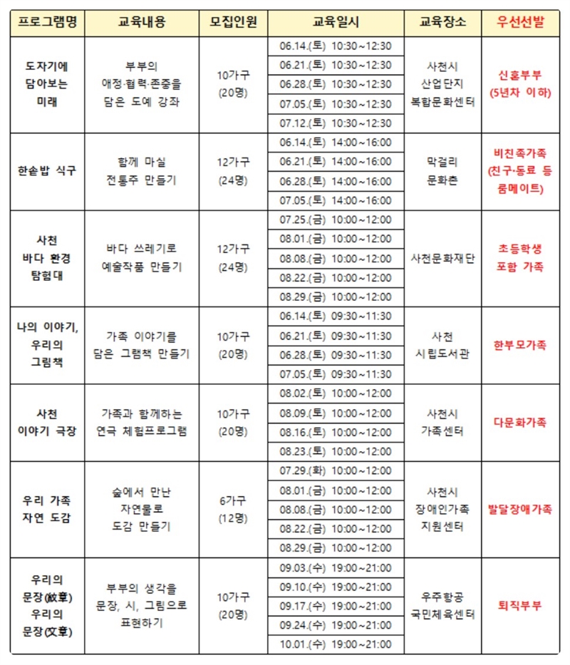 주요 프로그램은 ▲도자기에 담아보는 미래(도예/신혼부부 우선선발) ▲한솥밥식구(전통주 만들기/비친족가족 우선선발) ▲사천 바다 환경 탐험대(시각예술/초등학생 가족 우선선발) 등이다.