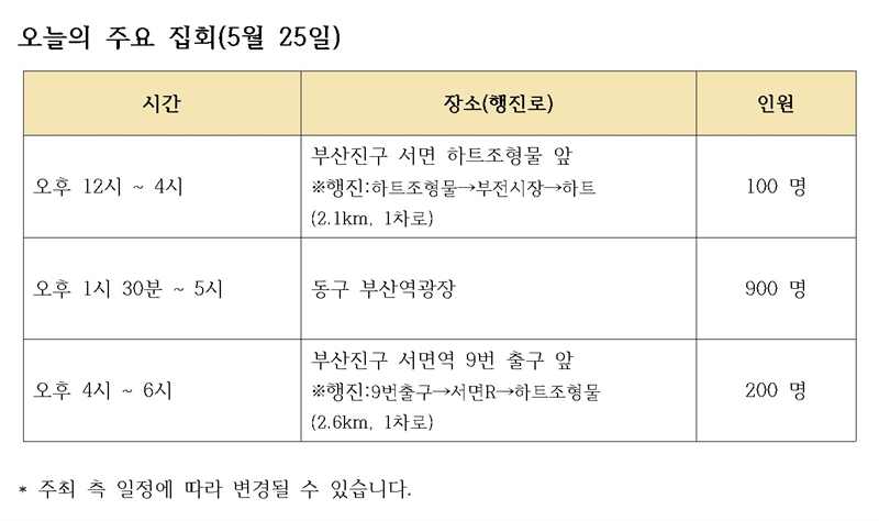 더경남뉴스는 부산경찰청이 제공하는 예정된 집회 내용을 주기적으로 전합니다. 각종 집회가 전하는 메시지도 있지만, 교통 정체 등 주민 생활에 직접 관계가 있기 때문입니다. 3 0 더경남뉴스 더경남뉴스 thegnnews@naver.com 더경남뉴스의 기사 더보기 저작권자 ⓒ 더경남뉴스