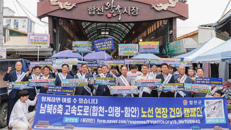 경남 합천군은 13일 합천왕후시장 5일 장날을 맞아 합천읍 일원에서 남북6축 고속도로의 합천·의령·함안 구간 연장을 위한 홍보 캠페인과 서명운동을 했다.