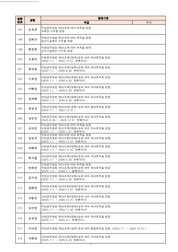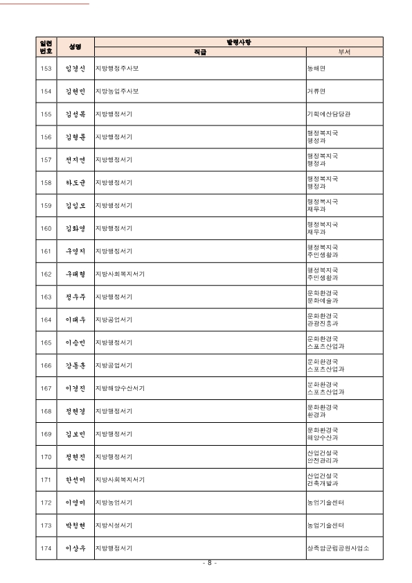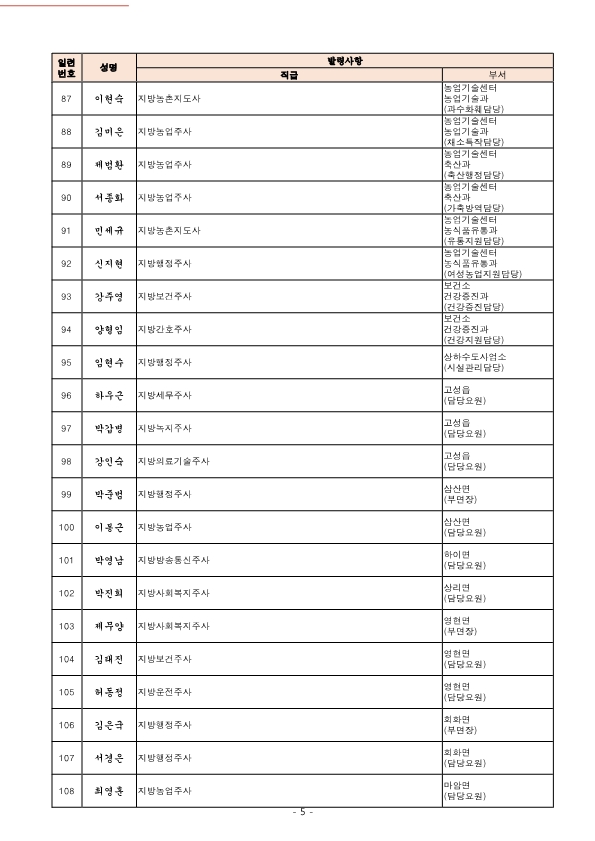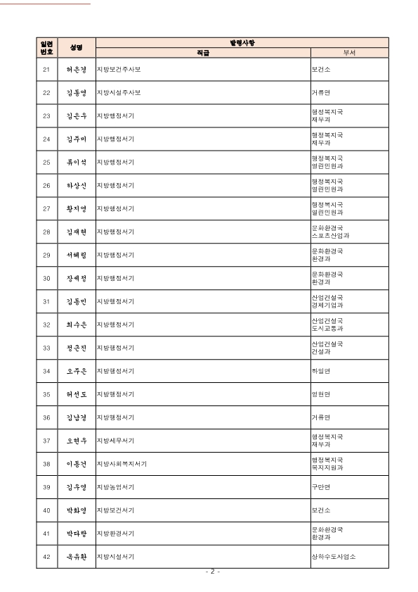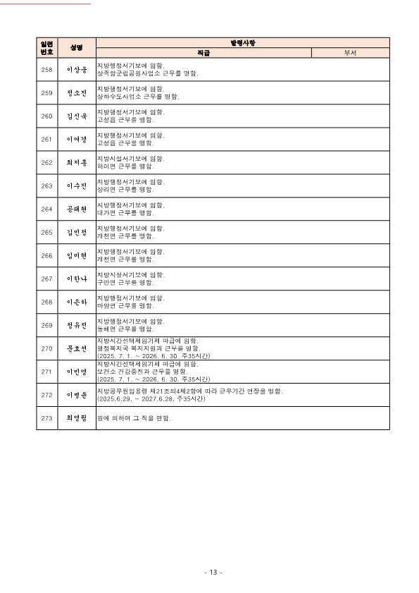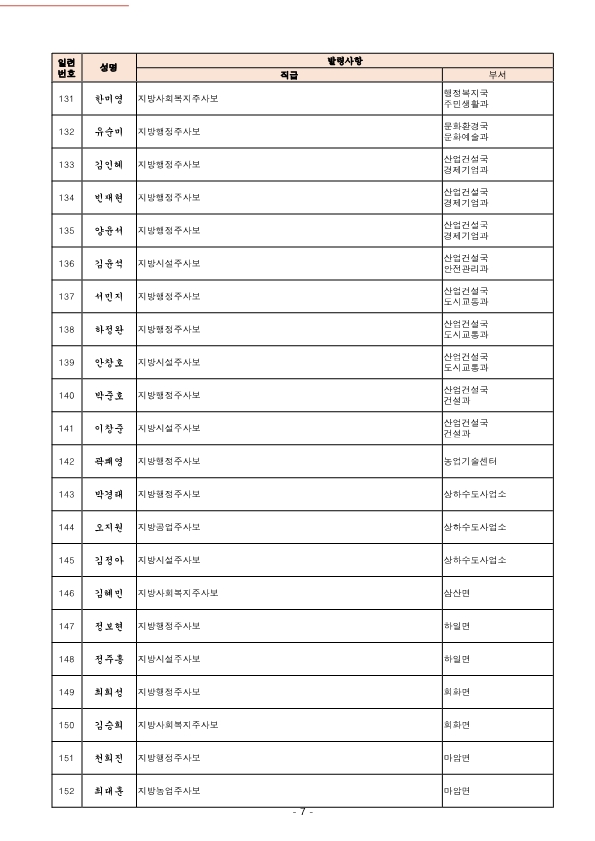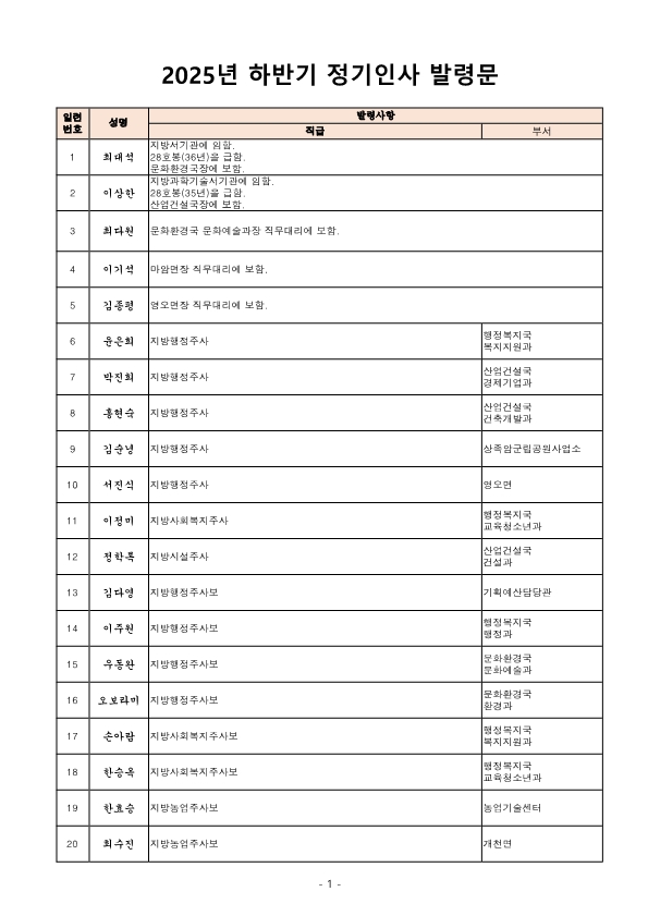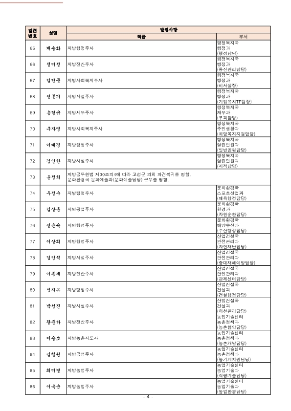 이번 정기인사는 ▲4급 2명(기획예산담당관 최대석, 건설과장 이상한) ▲5급 3명(행정과 이기석·김종평, 문화예술과 최다원) ▲6급 7명 ▲7급 10명 ▲8급 24명 등 46명의 승진과 138명의 전보 등을 포함해 총 273명이다.