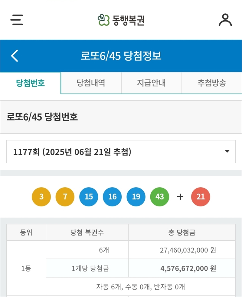 로또복권 운영사인 동행복권은 제1177회 로또복권 추첨에서 '3, 7, 15, 16, 19, 43'이 1등 당첨번호로 뽑혔다고 21일 밝혔다.