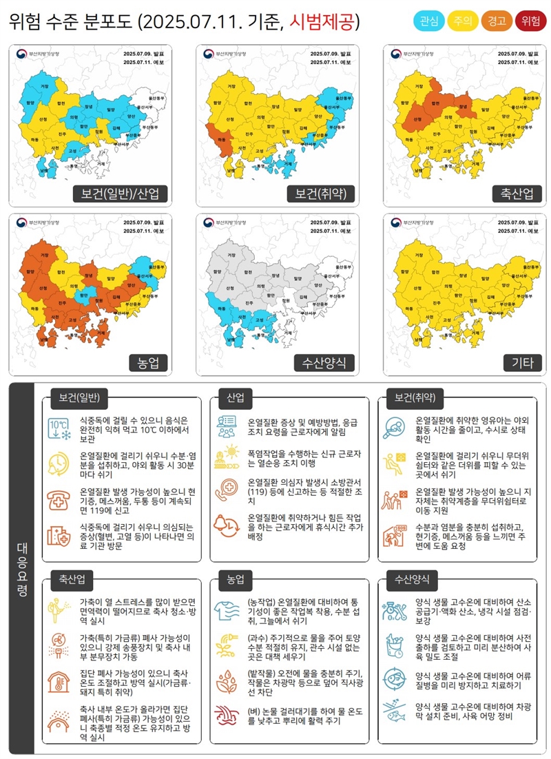 ○ 폭염주의보: 부산(부산중부, 부산서부), 경남(양산, 창원, 거창, 의령, 사천, 고성, 남해, 통영)