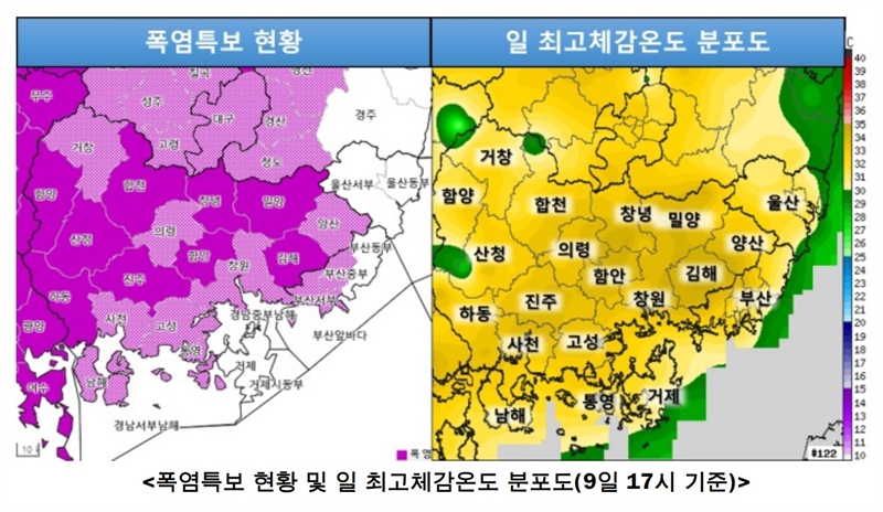 ○ (현황) 부산(부산중부, 부산서부), 경남(거제 제외)에 폭염특보가 발효된 가운데, 9일 대부분 지역에서 일최고 체감온도가 32~35도 분포로 매우 무더운 날씨가 이어졌습니다.