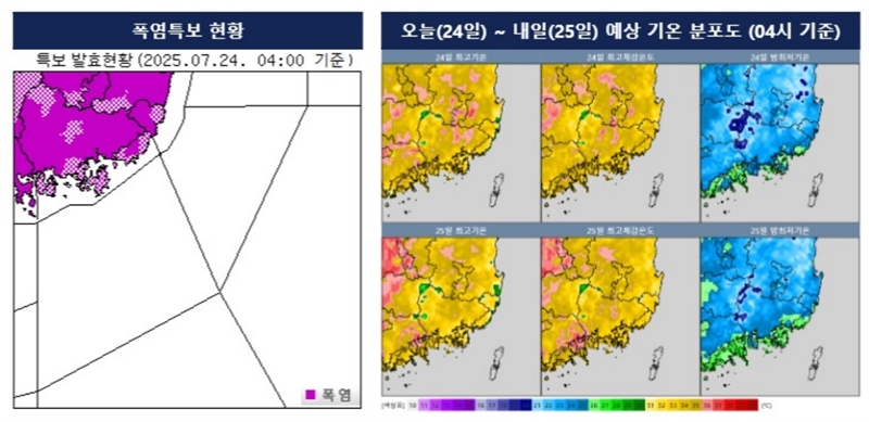 <폭염특보 현황과 24~25일 예상 기온 분포도>