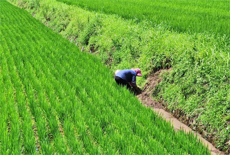 경남 진주시에 폭염경보가 발효된 가운데 한 여성 농업인이 폭우로 무너진 논둑을 손보고 있다. 정창현 기자
