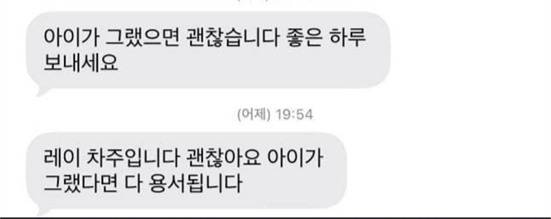 그는 “아이가 그랬으면 괜찮습니다. 좋은 하루 보내세요”, “아이가 그랬다면 다 용서됩니다”라며 수리비를 요구하지 않았다.아이 아버지는 “전화를 걸었지만 차주는 받지 않았고, 문자로만 답했다”며 “요즘 같은 세상에 이런 분이 계시다니 감동을 받았다”고 전했다.