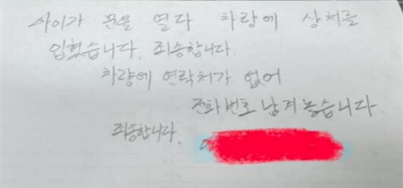 메모에 “아이가 문을 열다 차량에 상처를 입혔습니다. 죄송합니다. 연락처가 없어 제 번호 남깁니다”라는 글을 적었다.