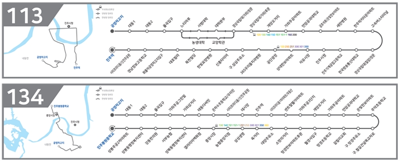 ‘113번’은 경상국립대 가좌캠퍼스 내부와 칠암캠퍼스 앞을 잇고, ‘150-2번’은 초전동과 충무공동의 중고생 통학 수요를, ‘200-1번’은 평거동~가좌동~진주역세권~충무공동 노선의 배차 간격을 좁혔다.
