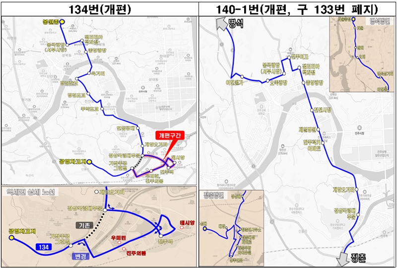 이와 함께 정촌면의 인구증가와 출퇴근 유동인구 증가로 기존 ‘133번(진양호차고지~중앙시장~주약동~경상대 가좌캠~정촌면사무소~심대마을)’ 노선을 ‘140-1번(심대마을~정촌면사무소~경상대 가좌캠~중앙시장~명석면)’으로 개편했다.