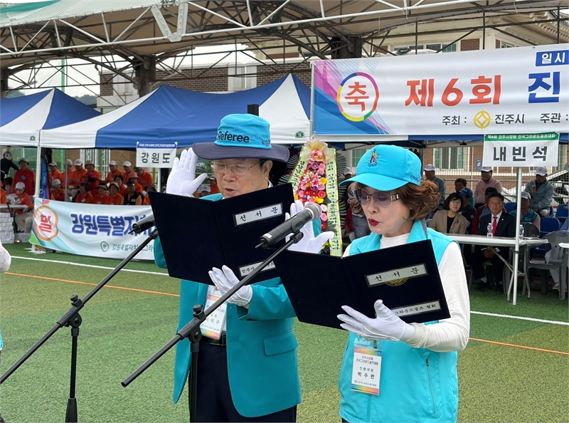 2일 진주스포츠파크에서 열린 ‘제6회 진주시장배 전국그라운드골프대회’에서 남녀 선수 대표가 페어플레이 선서를 하고 있다.