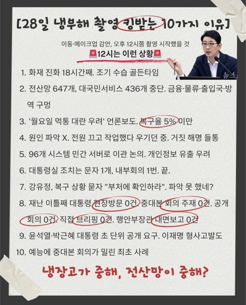이후 이 대통령은 28일 오전 10시 50분 열린 '국가정보자원관리원 화재 관련 긴급 비상대책회의'에서 비서실장, 안보실장, 정책실장 등에게 직접 화재 관련 상황을 대면 보고받았다고 했다.
