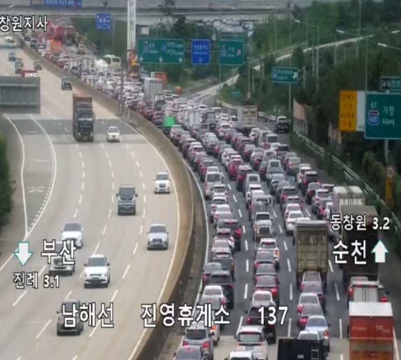 4일 오전 8시 30분쯤 진영휴게소 도로 인근이 대형 화물차 4대 사고로 극심한 교통정체를 빚는 모습. 한국도로공사 교통정보
